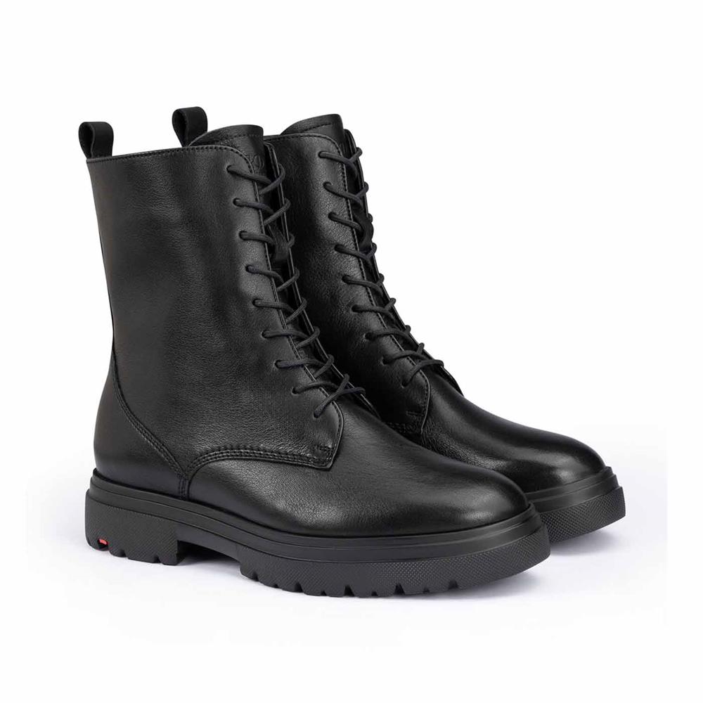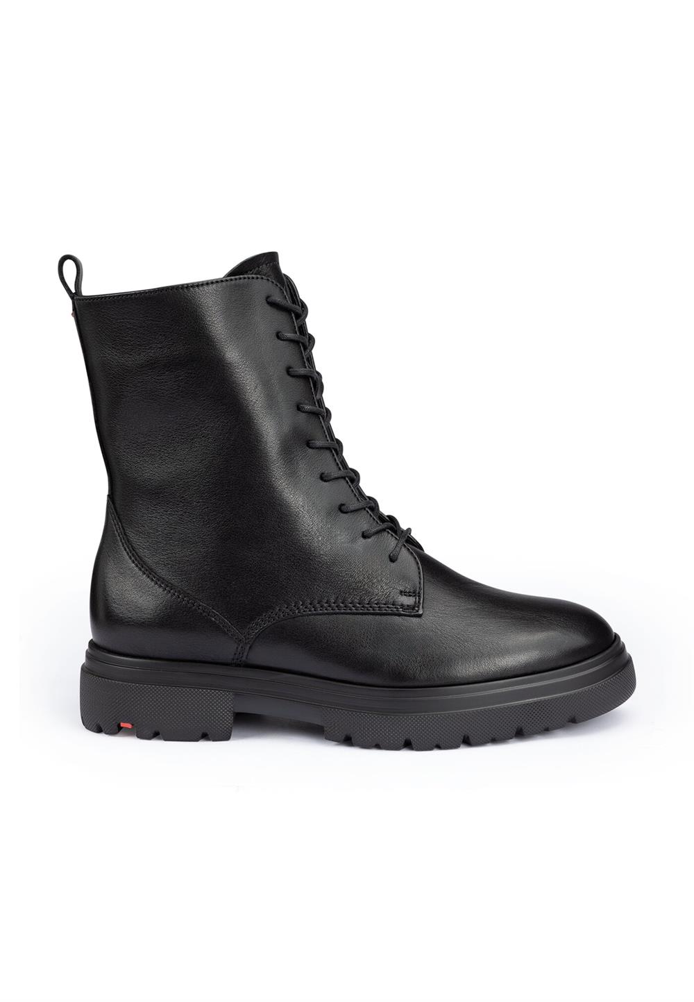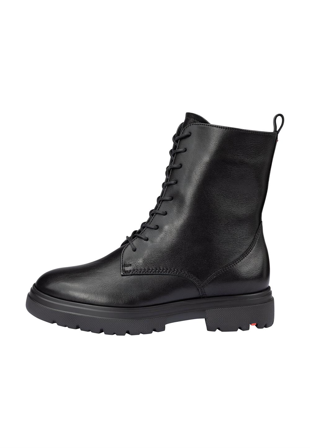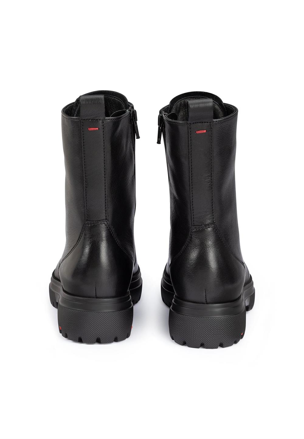 LLOYD-støvlerne er lavet af sort, glat læder og har en robust, stødabsorberende sål. Disse støvler er det perfekte valg til enhver garderobe, da de kan kombineres med mange forskellige outfits. Den fleksible gummisål sikrer en optimal støddæmpning ved hvert skridt, hvilket gør dem utroligt behagelige at gå i. Indersålen er foret med 100% uld, som ikke kun holder fødderne varme, men også giver en hyggelig komfort på kolde dage. Støvlerne har en lav blokhæl, der giver et solidt fodfæste og gør dem velegnede til daglig brug. Det bløde, glatte læder og lynlåslukningen skaber et klassisk og elegant udseende, samtidig med at de er nemme at tage på. Uanset vejret holder disse støvler dine fødder varme og godt isolerede takket være uldforet.